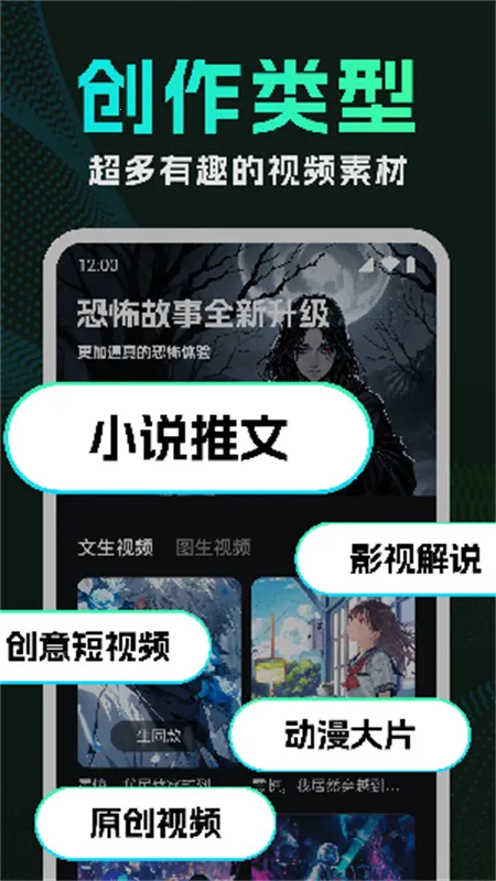 4. 创作类型多样:多种创作类型随意选择,丰富的视频素材随心挑选,满足各种创意视频制作需求。