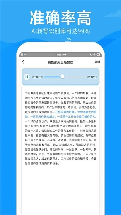识别准确率高,采用先进的AI技术,转文字识别准确率可达99.5%。