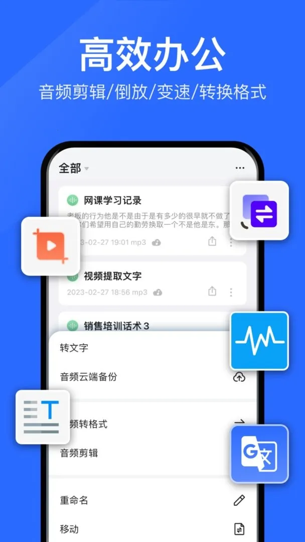 3. 多场景适用:涵盖会议、采访、学习、演讲、授课等多场景,语音速记、录音转文字、语音翻译等功能强大。