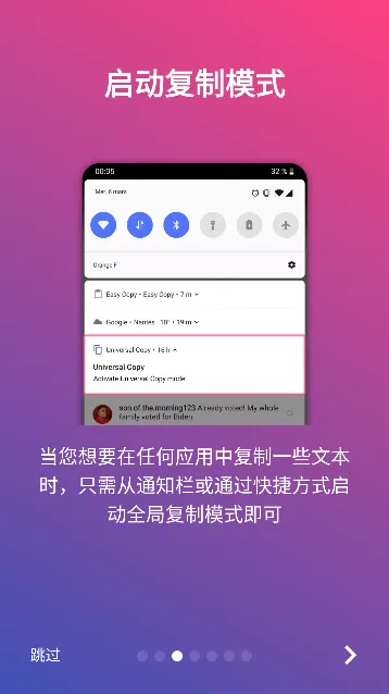 使用教程简单易懂。下载安装后,激活通用副本辅助功能,打开要复制文本的应用,从通知栏单击激活通用复制模式,选好文本点击复制就行。有了全局复制,复制文字超方便,再也不用担心复制不了啦!