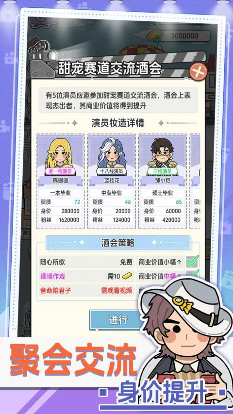 2、演员个性养成系统:每位演员有独特性格天赋等,通过多维度培训提升能力,维护好感度以防罢演或被挖角。