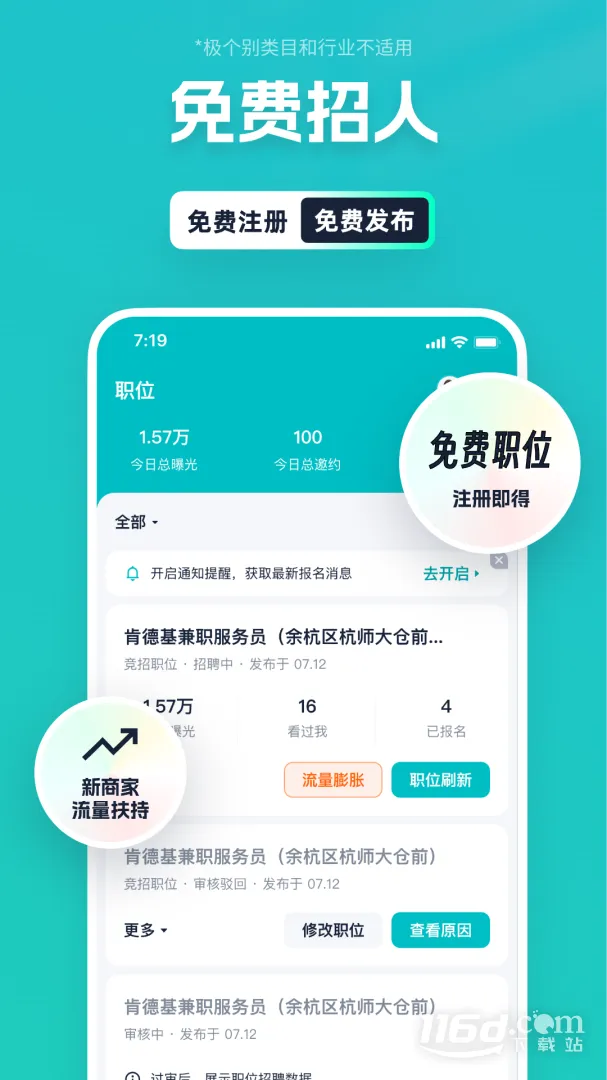 3. 便捷沟通与发布:app内私聊沟通工作详情,能建交流群,快捷发布工作内容,一键消息群发、短信群发,摆脱重复沟通。新用户免费查看10位求职者报名信息,后续收费低至3元/人。