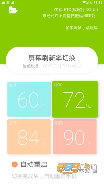 ETO屏幕刷新率2025官方最新版本是一款可一键切换屏幕刷新率的工具,能让手机达更高水准,目前仅支持小米9和红米K20Pro,自动识别安卓P和Q版本,使用需ROOT权限,玩机有风险,超屏后果自负。
