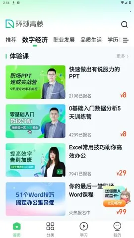 很多人想知道环球青藤有没有“5天8元”的优惠。其实,环球青藤是一款专注年轻人职业和生活技能提升的学习软件。它提供丰富课程,涵盖职业考证、职业提升等多个板块。不管你是想考资格证,像英语四六级、教师资格证等,还是提升职场竞争力,这里都有适合的课程。软件优势明显,会根据你的学习基础和兴趣自动推荐课程。学习不止理论,很多课程含实际操作,助你快速提升能力。平台还会提供学习评估,导师随时解答问题。其功能便捷,课程在线学习,能随时安排时间,上班族和学生都能轻松学。而且能跟着平台建议逐步掌握新技能,甚至组队完成任务。虽然不是所有课程免费,但有优惠活动等。总之,环球青藤能满足你多方面学习需求,助力自我提升。