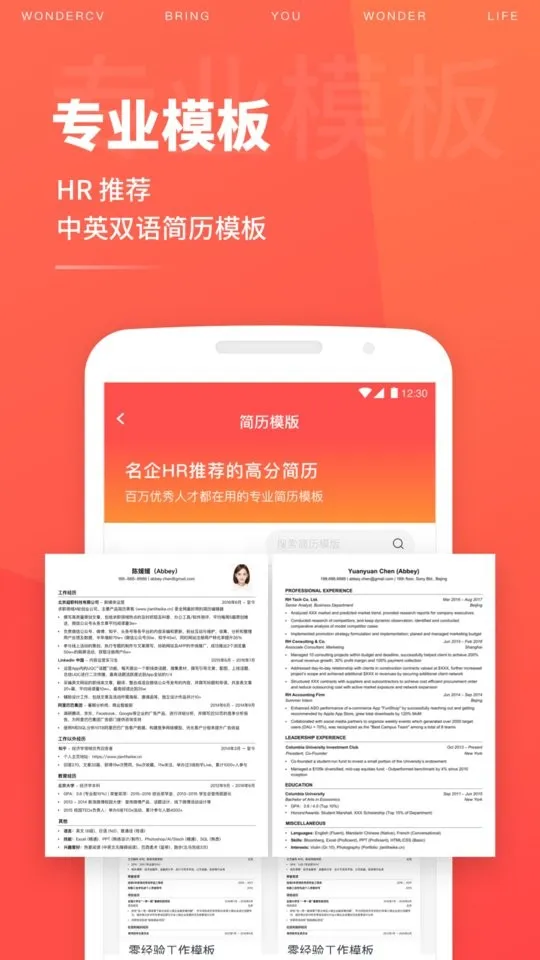 4. 中英文双语简历模板由专业HR推荐,支持一键在线翻译,简化多语言简历制作流程,信息加密存储于云端,电脑手机可同步编辑。