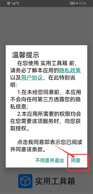 1、启动实用工具箱,阅读隐私政策及用户协议后,点击同意进入应用。