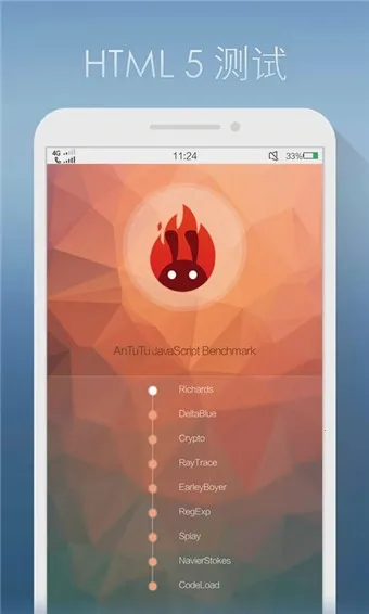 4、具备最直观的html5性能测试,酷炫的测试场景,每个测试项目过渡流畅,能直观显示设备的html5性能。