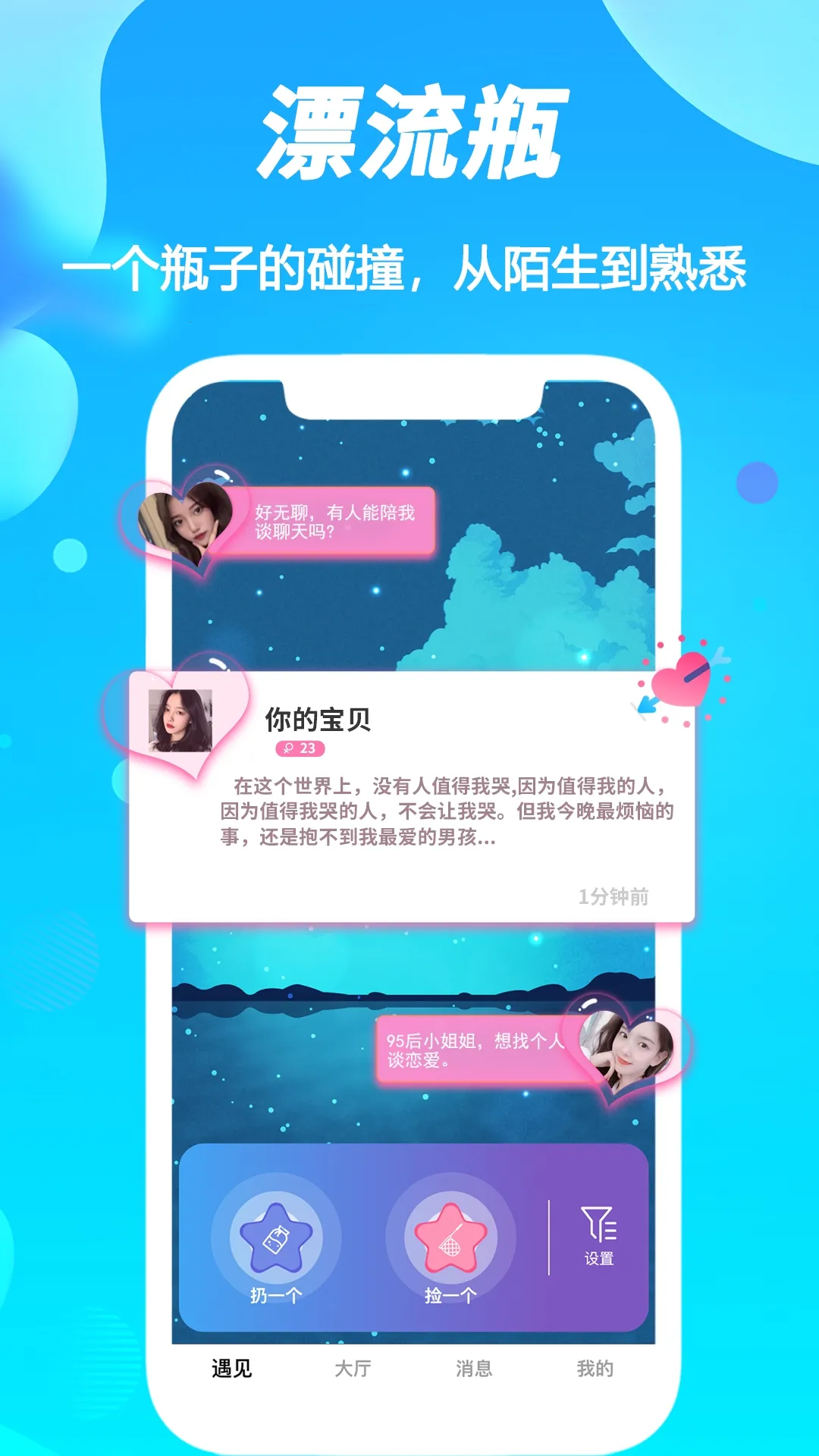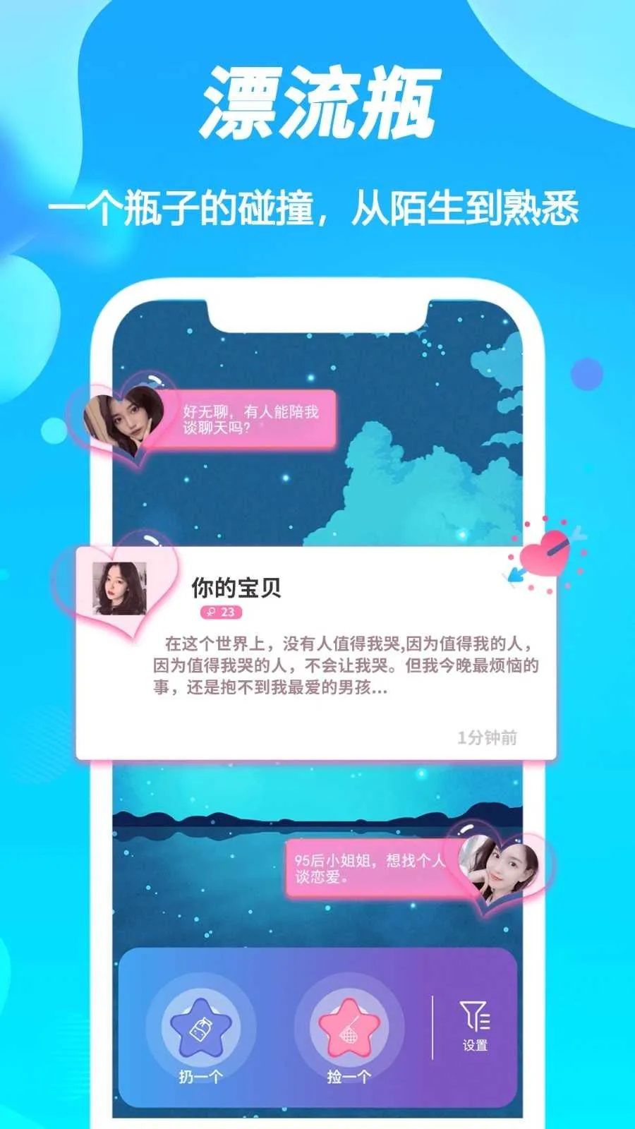 3. 功能丰富玩法多:既保留漂流瓶怀旧趣味,又融入视频聊天、同城约会、兴趣社群等现代功能,设有多个板块,满足多样需求。