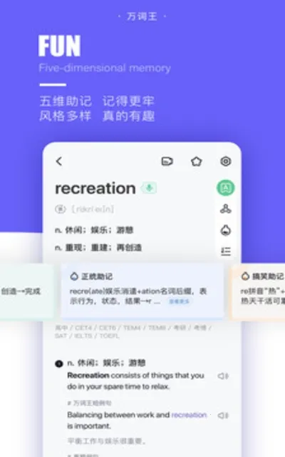 3. 四维助记:基于超级记忆原理,为单词提供正统、巧记、搞笑笔记四种记忆模式,使记忆更牢固。