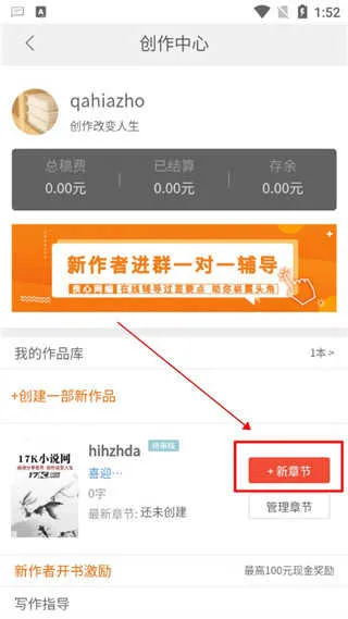 进入17k小说网写作app软件,然后依次点击“我的”、“创作中心”;