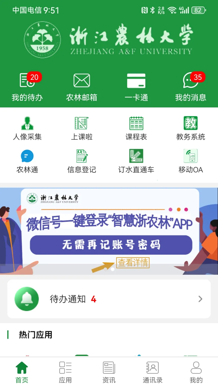 要是真忘了密码也有办法找回。教职工可登录智慧浙农林APP,在最底部点击应用,搜索信息登记,输入正确手机号、短号、办公电话、固定电话等信息,点保存提交。通过这些操作,就能轻松解决密码遗忘问题,继续畅享智慧浙农林app带来的便利。它功能超丰富,有多种实用校内应用,涵盖学工、教务、生活服务、学习工具等方面。能让你第一时间掌握校园最新资讯动态,轻松查询课表、一卡通等信息,加强全校师生联系,为校园生活带来极大便利。