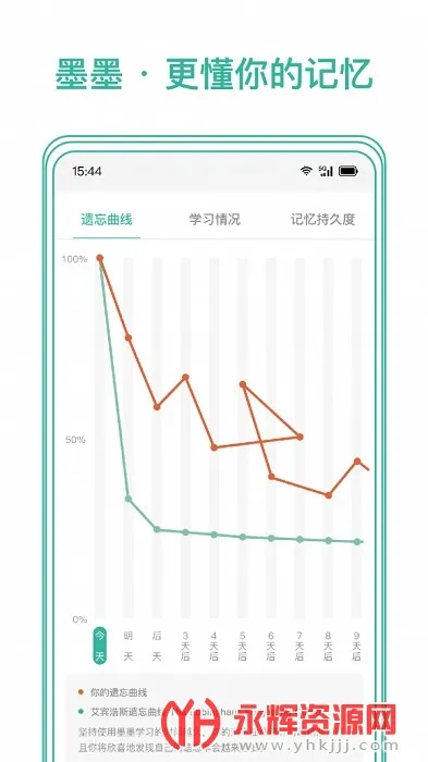 4. 多维度学习反馈:通过遗忘曲线真实反映各阶段知识遗忘率;记忆持久度清晰展示熟知度变化趋势;签到日历可见证坚持并生成图片发朋友圈;还能了解每日复习量、过去已学情况及未来复习压力。