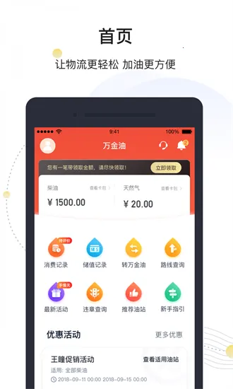 万金油司机端安卓版手机版是专为货车司机打造的线上接单办公平台,覆盖全国多地。可线上接单,方便加油,展示附近加油站,有优惠活动。还能查询账单,支持加油码快捷加油、加油卡管理、油站查询导航等功能。