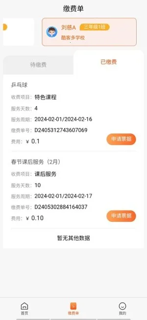 4. 功能多样:能生成缴费单、查看课程详情、自由修改账户密码,还支持在线报名、缴费、身份切换、查看学生考勤、联系客服等,满足多样化需求。