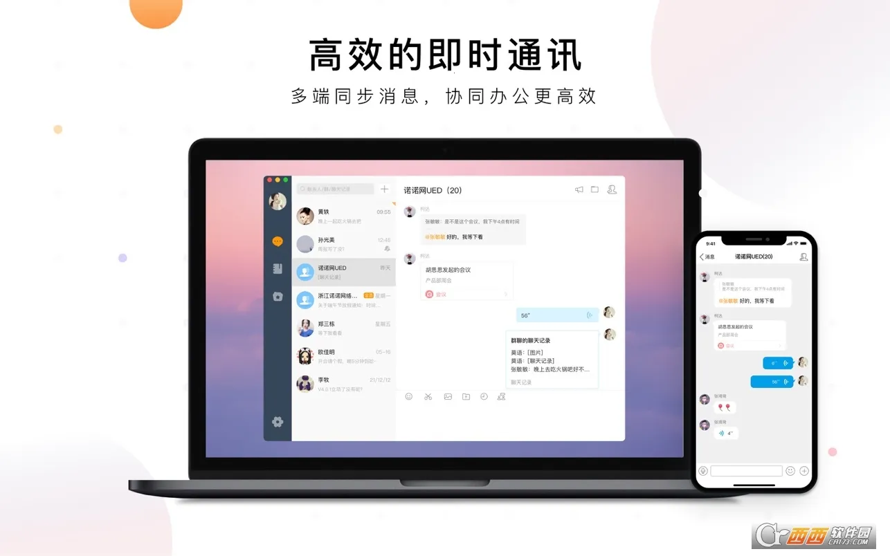 2. 高效即时通讯与纯净办公环境,提供文字、语音、视频等多种沟通方式,支持多人同时在线音视频互动,消息多端同步,沟通更便捷高效。