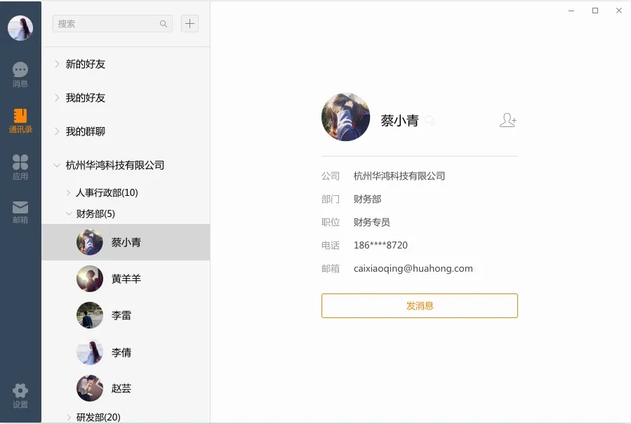 4. 企业通讯录与实名管理,内置实名通讯录,员工可快速查找同事联系方式,支持直接发起聊天或群聊,方便企业内部沟通。