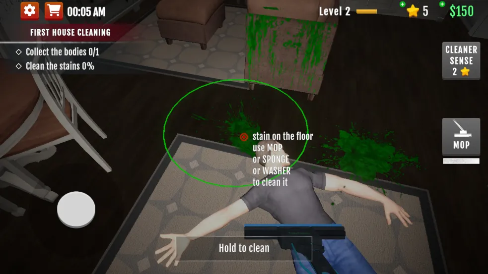 6、这时候我们点击【MOP】拿出拖把,将中间的光标对准地上的血迹出现圆圈时长按就能开始清理。