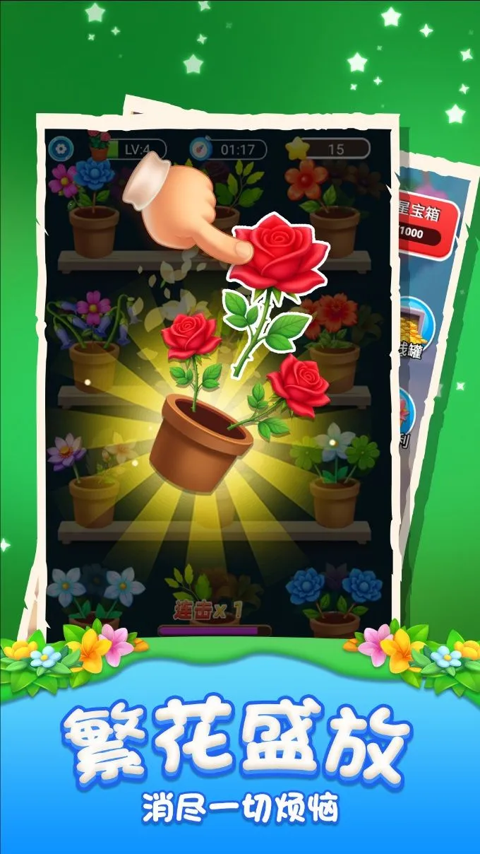 1. 经典三消玩法,滑动花朵将三个相同花朵放入花盆即可消除,带来沉浸式消除体验。