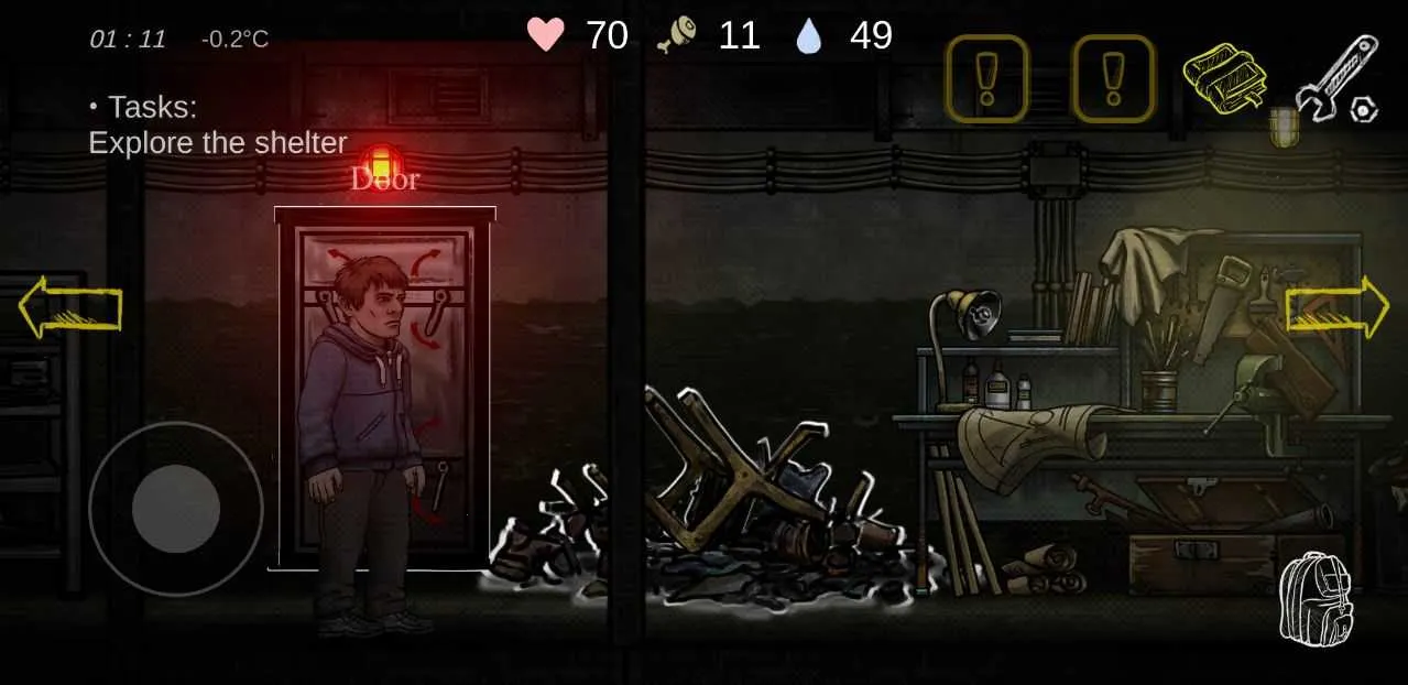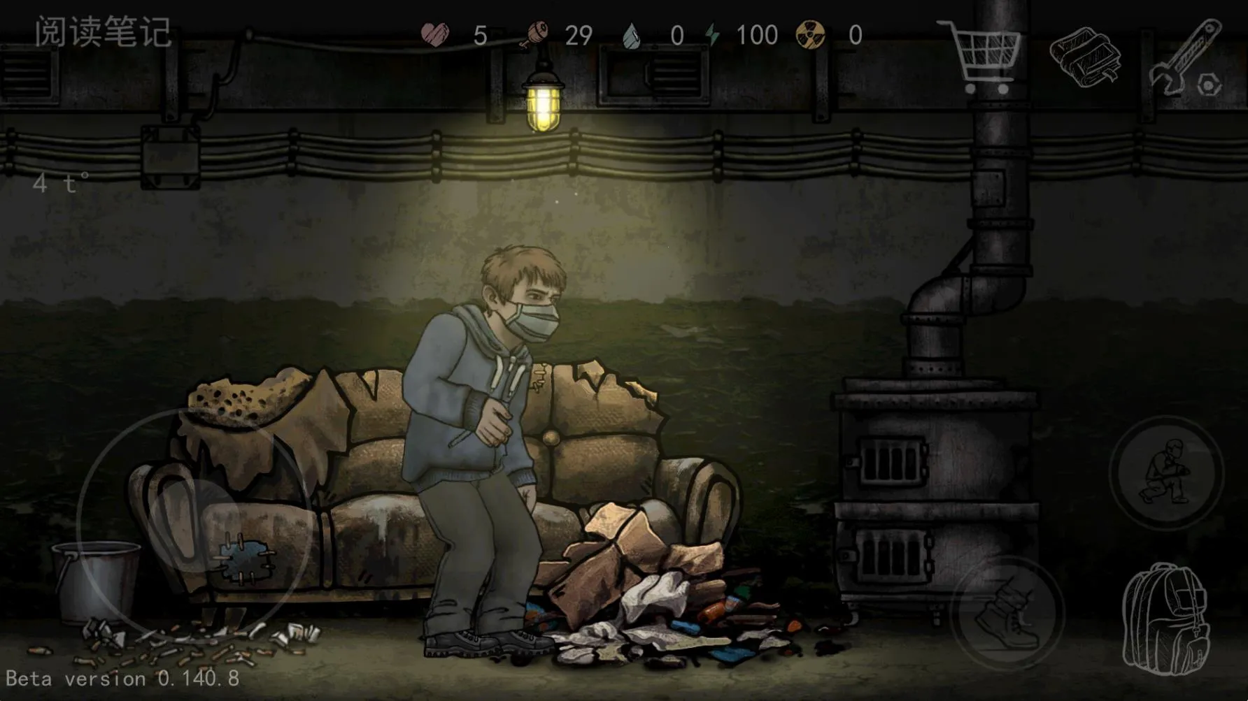 它的玩法丰富多样。进入游戏后,点击新游戏,先过一段剧情,之后就能正式开始啦。左边控制移动,右边负责蹲下、跳跃和打开背包。搜索不同地点可获取各种物资,屏幕上方显示玩家属性,像血条、饥饿、口渴、能量和辐射等。你要收集物品修复地堡,还能结识伙伴一起对抗末日。而且游戏有动态天气,各地区环境不同。