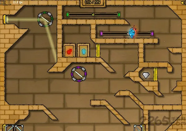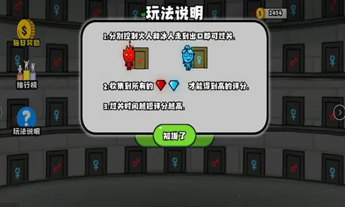 要过24关,首先让火人下来找到开关并推一下,接着冰人上楼把小石头往左推,之后冰人下来和小石头一起推上去打开机关。然后火人将箱子推出左边砸到下面按钮打开第二道门,冰人就能跟火人跳上去通关啦。这游戏操作简单,虚拟按钮控制角色移动。还能联机,和好友一起玩超欢乐。关卡丰富多样,每次挑战成功有金币奖励,能买装备道具。快来试试,看你能不能顺利闯过24关!