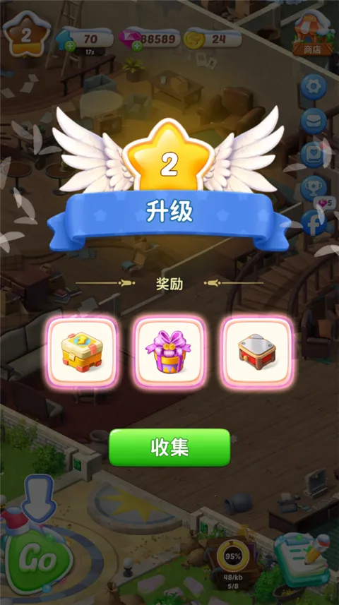 2. 合成玩法多样:通过两两重叠合成获取高等级物品,完成任务赚取金币,用于翻新度假村、提升等级和解锁内容。