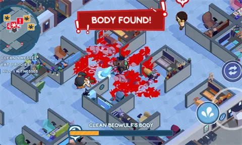 它的玩法丰富。能用多种工具完成清洁任务,从初期的水管、拖把,到后续解锁的更多工具,应对复杂场景。隐藏身份很关键,被同事看到狼人真面目,就得赶紧攻击清理,否则任务失败。速度还决定评分,完成时间越短得分越高。