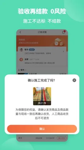 3. 灵活支付与施工保障:无需预付60装修款,无捆绑消费,买多少付多少,装修施工灵活自由购买;工匠完成施工,用户验收合格再确认收货付款,施工0风险。