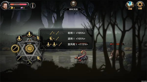 右上角【技能】按钮可随时打开技能面板,查看当前已解锁技能的触发条件、指令组合及冷却状态;连招提示清晰,助你快速掌握高阶操作节奏。
