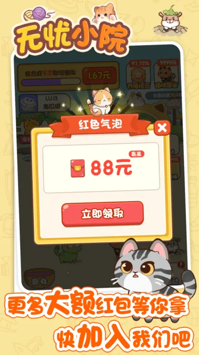 无忧小院是一款超有趣的模拟经营游戏。在这游戏里,能体验田园生活,感受经营农场的乐趣。你可以自由选择种植喜欢的作物,通过培育成熟后交易来获得金币收益。比如种上各种农作物,收获后拿去卖就能赚钱啦。还能和小猫咪互动,快速获得更多收入。作为农场主,用心经营管理农场,售卖农作物赚取金币和经验来升级,进而购买和扩建土地,让农场越来越大。而且和游戏中的人物互动,能解锁更多游戏模式,推动剧情发展。玩法简单易上手,放置点击操作就行。完成主线任务还有更多试炼难关等你挑战,解锁新内容能收获更多快乐。这里不仅能享受惬意的游戏体验,说不定还真能帮你赚到零花钱呢,快来试试吧!